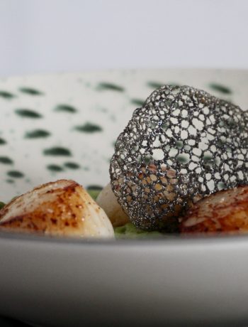 Vous ferez ensuite des tuiles salées qui viendront agrémenter vos noix de St Jacques et purée de petits pois. J’ai ajouté du colorant noir car je trouve que ça fait un beau visuel. Ce n’est pas incontournable (l’encre de seiche sera parfaite aussi pour donner cette teinte). Là aussi, les tuiles peuvent être préparées à l’avance et ne prennent que peu de temps de préparation.
