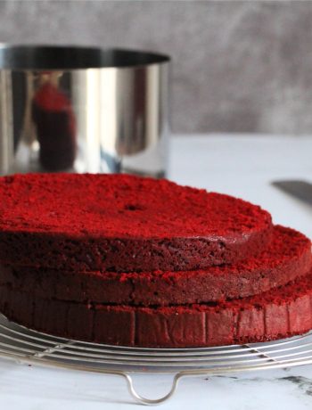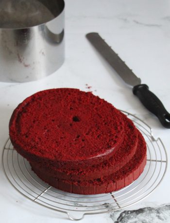 Côté organisation, je vous recommande de bien lire le déroulé de la recette du red velvet layer cake en premier lieu. La veille, vous préparerez la ganache et le confit de framboise. Vous pouvez également faire votre gâteau. Le jour J, vous monterez la ganache, vous découperez le gâteau et vous procèderez au montage et à la décoration du red velvet layer cake. Je conseille de le réserver une heure minimum au réfrigérateur après montage pour avoir une meilleure tenue.