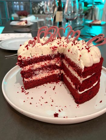 Ce red velvet layer cake est parfait pour les occasions festives. Alors le layer cake, tout le monde connaît : un fait un gâteau avec la base qu’on souhaite. Cela peut être une base avec un gâteau au yaourt, un molly cake ou une génoise par exemple. Et le red velvet (velour rouge dans la langue de Shakespeare !!) est tout simplement le résultat d’une bonne dose de colorant ! Rien de plus !