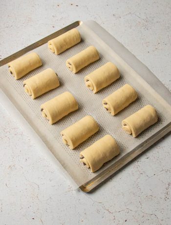 Disposez vos 12 pains au chocolat sur deux plaques de cuisson recouvertes de papier sulfurisé en les espaçant bien.