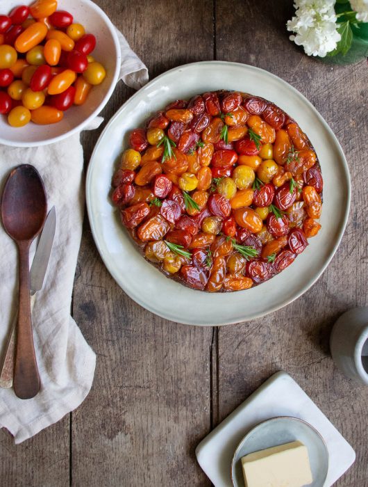 Dernière remarque qui a son importance : selon la qualité et la variété de vos tomates cerises, vous pouvez avoir beaucoup de jus dans votre moule en fin de cuisson. Pour éviter d’avoir une pâte détrempée, mais aussi une cata au démoulage, je vous conseille d’incliner votre moule en pressant délicatement sur la pâte et de faire couler le jus dans un récipient. Vous pourrez ensuite le servir comme un nappage sur la tarte Tatin aux tomates cerises que chacun versera dans son assiette. Ce serait effectivement dommage de la jeter car c’est ultra gourmand ! 😉