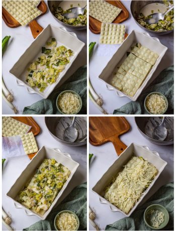 Étalez une couche de poireaux dans votre plat à gratin. Recouvrez d'une plaque de ravioles.