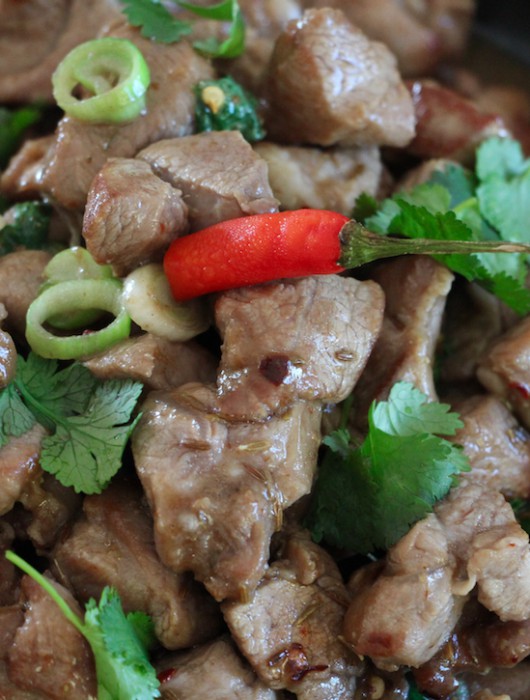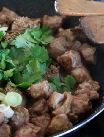 Je vous propose ici une version modifiée car au Xinjiang, région du Nord-Ouest de la Chine coincée entre la Mongolie, le Kirghistan et le Tadjikistan, on mange épicé. Mais alors épicé qui arrache !!! J’adore les épices, mon palet est habitué à une nourriture relevée après de nombreux passages en Asie. Mais là, franchement ça envoie du feu !! Vous aurez donc toutes les indications pour doser ce plat en fonction de vos envies ! 😉 On ne s’inquiète pas !!