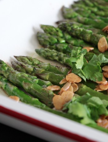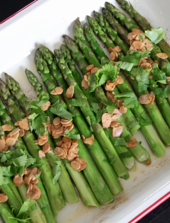 Aujourd’hui je vous propose une recette qui répond à cette problématique : les asperges vertes rôties aux amandes et coriandre.