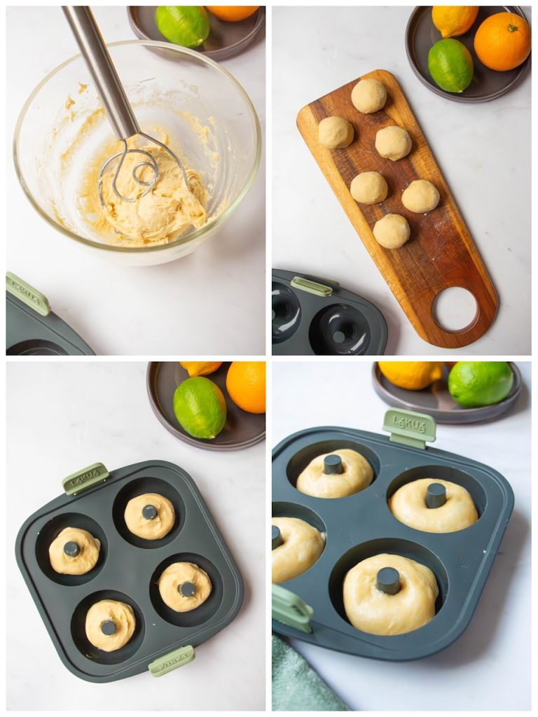 Réalisez 8 boules de pâte, faites un trou au centre et déposez vos cercles de pâte dans les moules à savarin préalablement beurré.