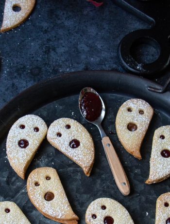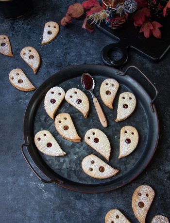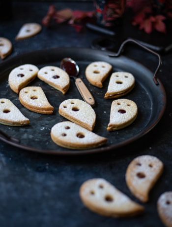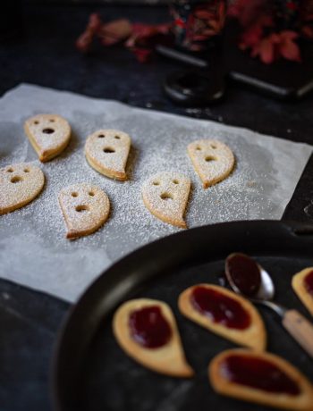 Mais revenons désormais à notre recette de biscuits fantôme pour Halloween… Elle est composée d’une pâte à biscuits aux amandes (elle pourra très bien être réalisée avec de la poudre de noisette si vous préférez) et de confiture de framboise ou de pâte à tartiner. Libre à vous de mettre d’autres accompagnements : confiture de fraises, d’abricots, pâte speculoos ou encore praliné. C’est comme on aime.