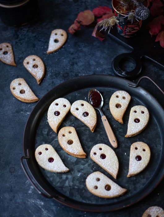 Mais revenons désormais à notre recette de biscuits fantôme pour Halloween… Elle est composée d’une pâte à biscuits aux amandes (elle pourra très bien être réalisée avec de la poudre de noisette si vous préférez) et de confiture de framboise ou de pâte à tartiner. Libre à vous de mettre d’autres accompagnements : confiture de fraises, d’abricots, pâte speculoos ou encore praliné. C’est comme on aime.