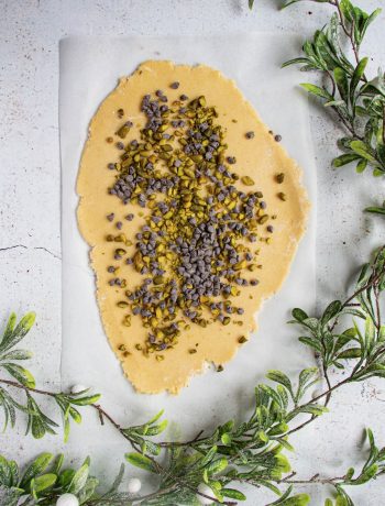 Étalez en forme de rectangle, saupoudrez les pépites de chocolat et les pistaches grossièrement hachées au couteau.