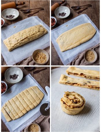 Façonnez un escargot et disposez sur une plaque recouverte de papier sulfurisé. Passez l'extrémité de la pâte sous votre escargot pour éviter que votre brioche ne s'ouvre à la cuisson.