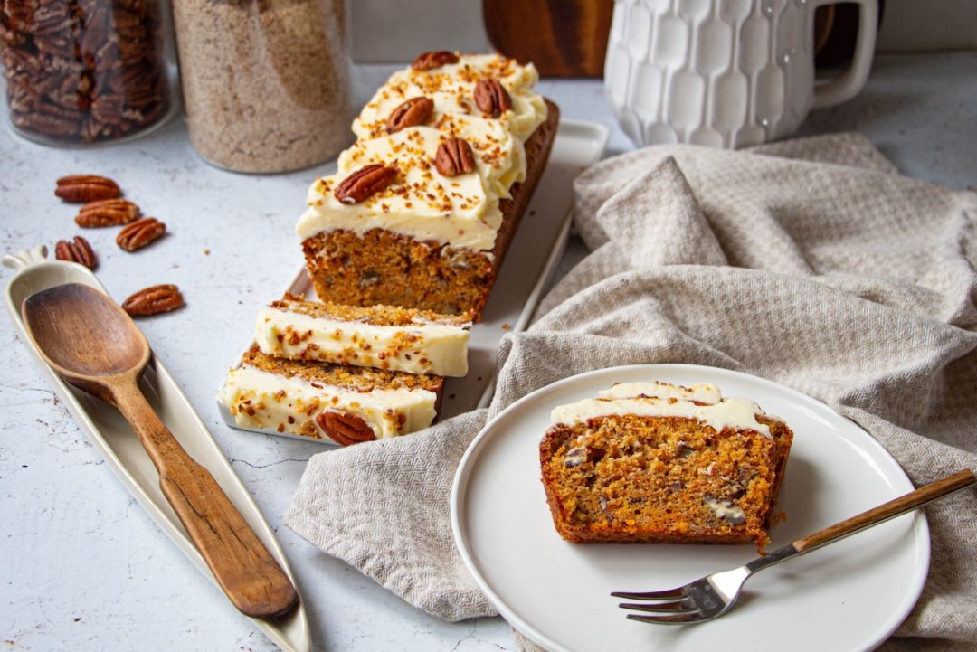La carotte râpée apporte naturellement du moelleux et empêche la pâte de sécher, rendant la texture souple même après cuisson. Les épices et les fruits secs tolèrent bien les variations, permettant d’adapter la recette selon les goûts (ici j’ai pris du pralin et des noix de pécan mais noisettes, noix de cajou ou amandes feront l’affaire !).