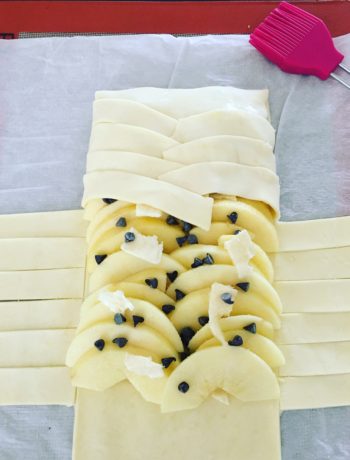 Rabattez le morceau de pâte du haut sur vos pommes, puis, alternativement, les bandes de côté (une à droite, une à gauche).