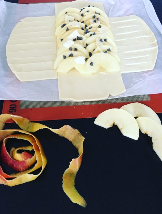 Déroulez votre pâte et disposez les pommes comme ci-dessous. Parsemez de pépites de chocolat et d’un peu de beurre bien réparti sur les pommes.