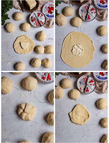Déposez un fromage Vache qui Rit au centre et rabattez les bords, en prenant soin de bien souder la pâte.