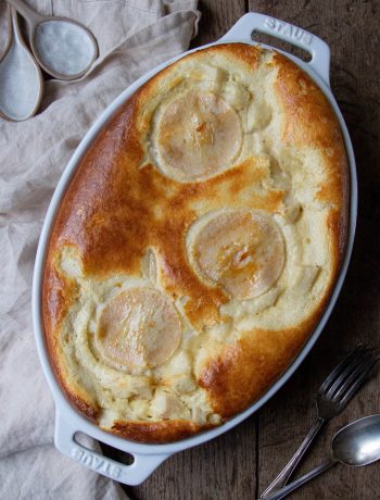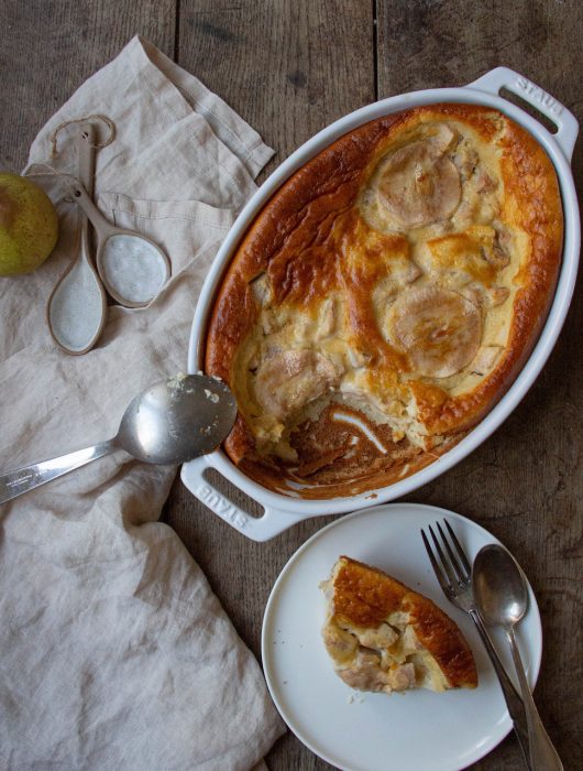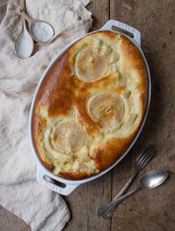 Alors, ce clafoutis aux poires c’est juste de la douceur, cuillère après cuillère… Préparez-vous… Il sera difficile de s’arrêter une fois que vous aurez plongé la première dans le plat ! 😉 C’est un dessert, ou un goûter, carrément doudou. Un truc qui fait du bien, un truc qui détend, qui ramène en enfance. Le genre de gourmandise que j’adore !