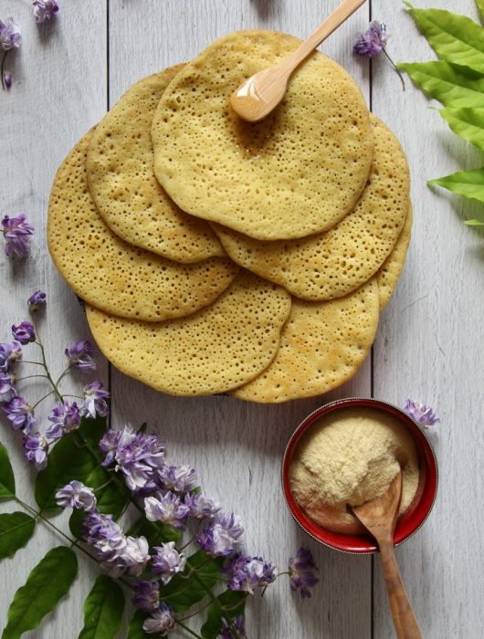 D’origine berbère, cette recette est plus légère que nos traditionnelles crêpes ou que les délicieux pancakes car il n’y a ni œuf ni lait. C’est donc une bonne solution pour les personnes intolérantes à ces deux ingrédients.