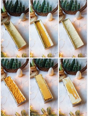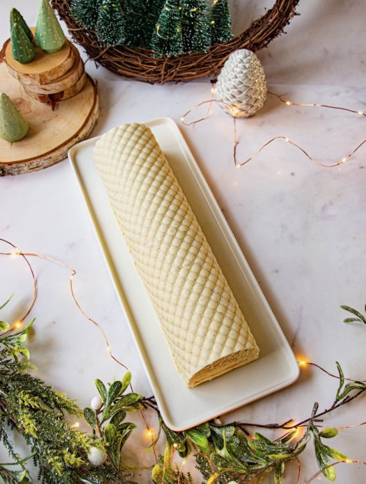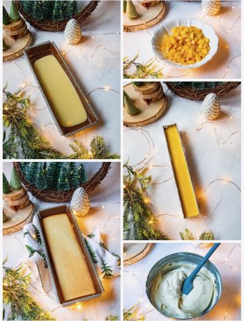 Je réalise ta bûche pour Noël. J’ai juste fait un petit ajout personnel en mettant dans la brunoise de mangue, le zeste d’un citron vert.