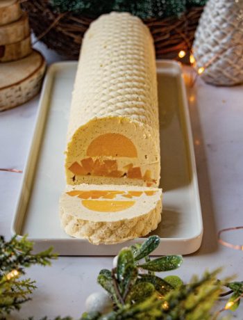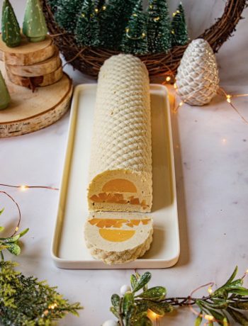 Vous sortirez votre entremet du congélateur et vous ajouterez une éventuelle décoration finale composée par exemple de quelques meringues ou de petits cubes de mangue. Mais ce n’est pas obligatoire. Je ne l’ai pas fait, j’ai opté pour une bûche toute en sobriété et élégance.