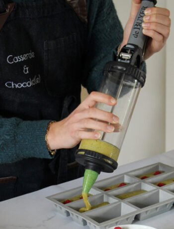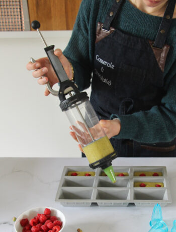Mais cette recette que je vous partage aujourd’hui a un plus que mes autres recettes n’ont pas : elle va vous permettre de tenter de découvrir le fameux Tube de chez De Buyer. Fini les galères de pochage à la poche à douille quand on est débutant en la matière, fini les galères de remplissage où on en met plein partout et bonjour la facilité !! Remplissage hyper pratique, aucune perte de préparation, pochage régulier grâce à la poignée, douilles variées et possibilité d’y mettre des préparations chaudes (pensez comme il est parfois compliqué de remplir des verrines, maintenant vous avez la solution !!).