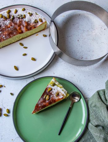 J’ai décoré mon flan à la pistache de sucre glace et de pistache fraîches non salées. Ce n’est pas obligatoire mais je trouve que ça rend bien !