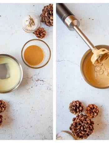 Toute la gourmandise de ce dessert tient à l’équilibre entre chocolat et noisette. J’ai donc choisi de faire une ganache praliné noisette. J’ai pris ma recette de ganache montée praliné, mais sans la monter ! 😉