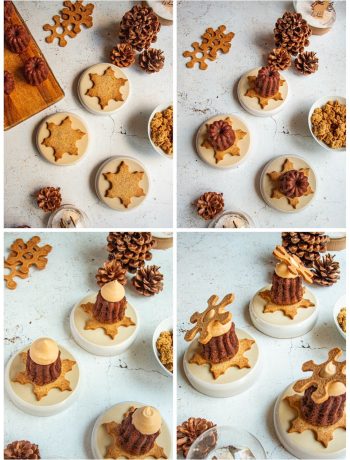 Disposez un biscuit noisette par-dessus et ajoutez 3 demies noisettes enrobées sur chaque gâteau.