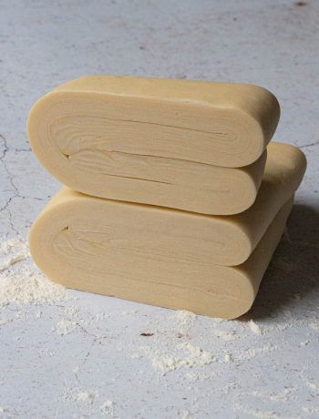 J’ai choisi ici la pâte feuilletée inversée qui donne ce rendu feuilleté à souhait. C’est un peu le top de la pâte feuilletée. Le principe de la pâte feuilletée traditionnelle est de faire une détrempe (une préparation à base de farine) et de mettre à l’intérieur votre beurre. Avec la pâte feuilletée inversée, on fait le contraire. On prépare un mélange beurre et farine et on vient y mettre la détrempe à l’intérieur. Après, c’est le même procédé : on plie, on étale, on plie, on étale, …