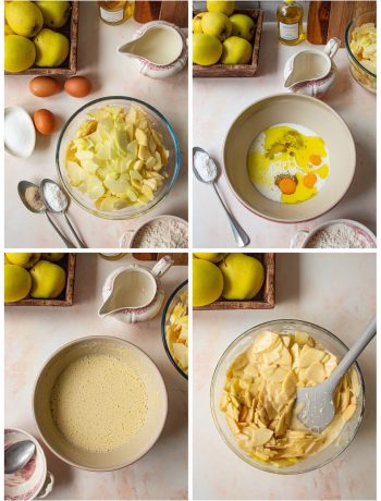 Versez la pâte sur les tranches de pommes et mélangez délicatement avec une spatule pour ne pas casser les tranches.