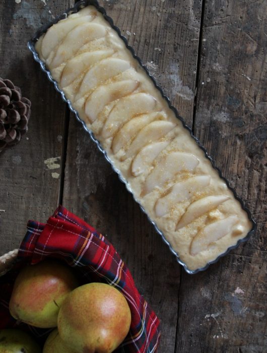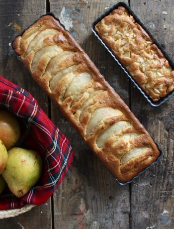 Et le résultat est à la hauteur des attentes, moelleux et parfumé ! On est effectivement dans le même registre que le gâteau aux pommes et mascarpone côté moelleux, mais avec des saveurs en plus (amandes, Grand Marnier…). Quand on utilise des « petites » poires (j’avais des petites Williams vertes), je pense qu’il faut doubler la quantité (2 dans le gâteau, 2 en déco).