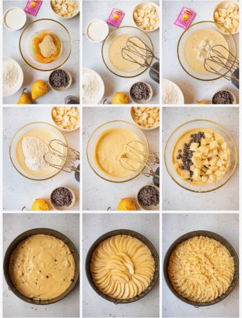Versez les cubes de poire et les pépites de chocolat dans la préparation, versez le tout dans votre moule préalablement beurré.