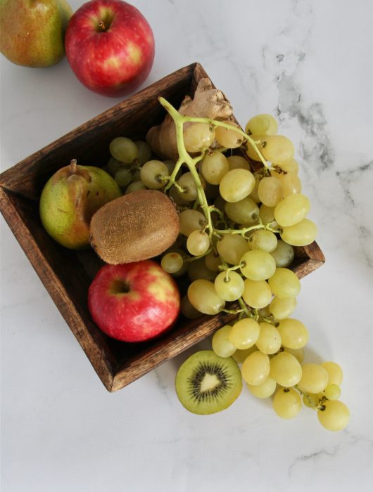 Mettez les cubes de pomme, poire, kiwis dans l'extracteur de jus. Ajoutez les grains et de raisin et le gingembre non épluché.