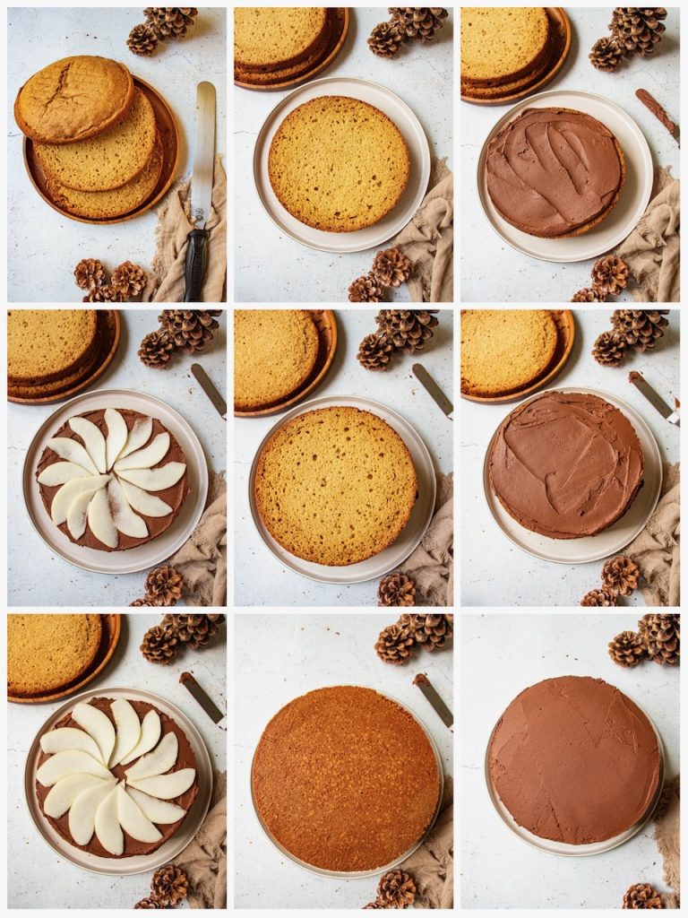 Prenez en compte que votre layer cake chocolat poire devra passer une heure au réfrigérateur après le montage.
