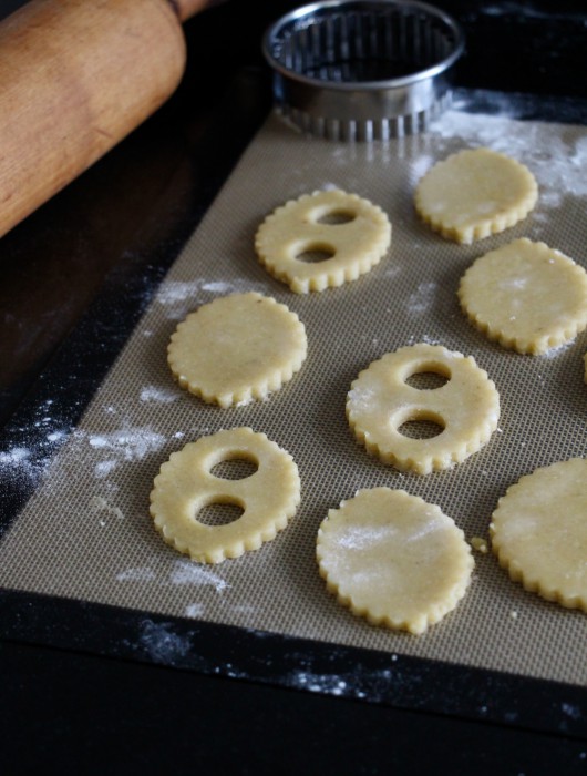 Il est préférable de travailler la pâte bien froide pour pouvoir plus facilement faire les formes. Je la remets souvent un peu au réfrigérateur ou au congélateur pour aller plus vite.Les Lunettes à la Confiture
