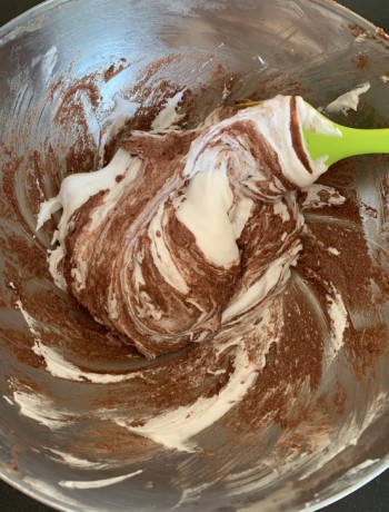 – pour mélanger votre préparation à macaron, vous allez « macaronner ». Il faudra mélanger délicatement à la spatule en partant du fond de votre bol et en remontant le long du bol tout en le tournant, histoire de rabattre la préparation vers le centre.