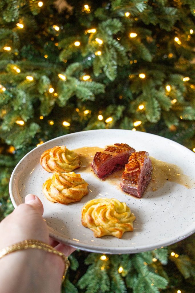 J’ai décidé de le servir avec des pommes dauphines faites maison. C’est un régal !