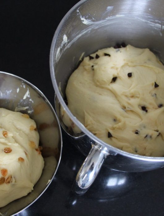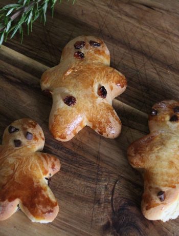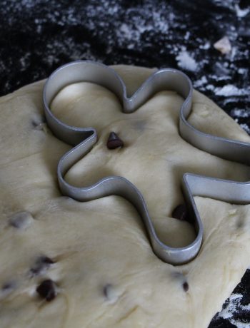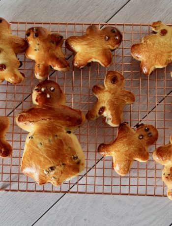 Traditionnellement, ce sont des brioches « nature » façonnées en forme de bonhomme auxquelles on rajoute des raisins blonds pour faire des yeux et une bouche. Évidemment, vous me connaissez, chez moi il y a aussi la version pépites de chocolat, et puis on ne va pas mettre que 3 pépites quand même !! Donc je prépare un pâton généreusement garni de raisins et l’autre de pépites de chocolat !
