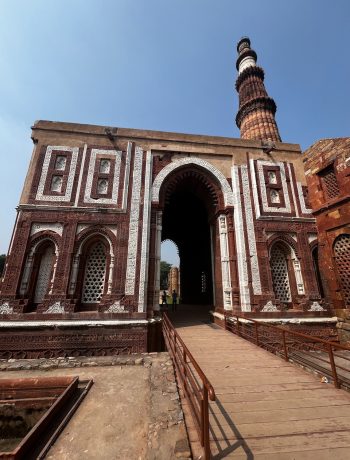 Premier arrêt : Le Qûtb Minâr. Site inscrit à l’UNESCO, c’est une tour de 73 mètres de haut construite au XIIe siècle pour célébrer la victoire musulmane sur les Rajputs. Son style indo-islamique et ses délicates inscriptions coraniques gravées dans la pierre en font un chef-d’œuvre historique.