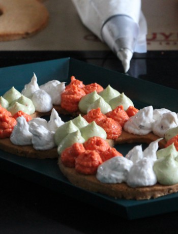 Pendant ce temps, réalisez vos garnitures. J’aime particulièrement y mettre une crème de poivron, une crème d’avocat, de l’houmous ou encore des rillettes de poisson (thon, maquereau ou saumon). Vous pouvez aussi prendre des préparations du commerce comme par exemple cette crème de chèvre et betterave de chez Albert Ménès. Un régal …
