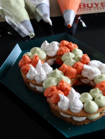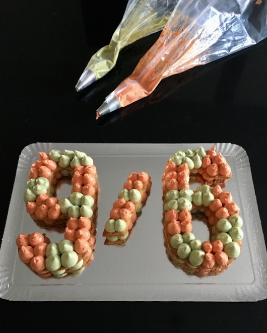 Disposez le premier chiffre sur votre plat à servir. A l’aide d’une poche à douille, faites de grosses « gouttes » de préparations et recouvrez intégralement le chiffre. Recouvrez avec le deuxième chiffre identique et recommencez.