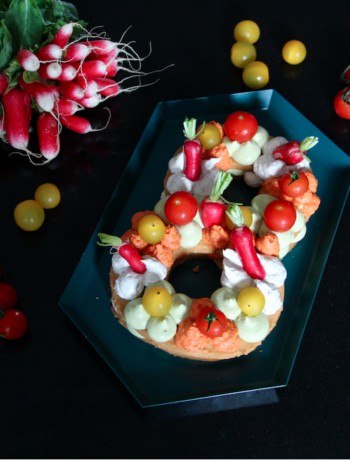 Pour finir, décorez votre number cake salé avec des radis, des tomates cerises, des bâtons de carotte crue ou de concombre, etc…