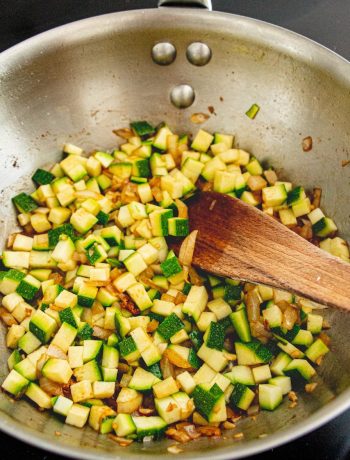 Ajoutez l'ail râpé et les courgettes coupées en petits cubes. Cuisez 5 minutes.