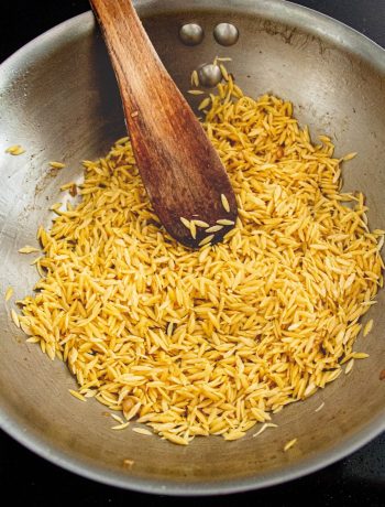 Réservez le contenu de la poêle et versez l'orzo dans la poêle.