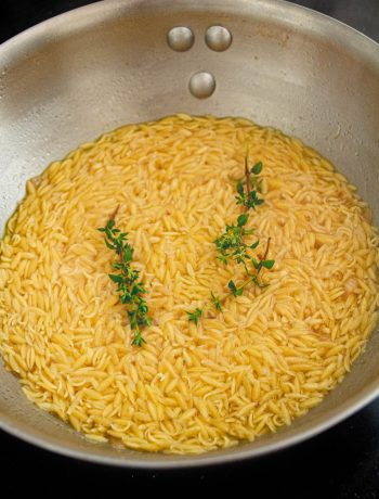 Cela faisait un bail que je voulais vous proposer une recette à base d’orzo. Ces petites pâtes m’intriguaient… et puis je trouvais que, visuellement, ça rendait plutôt bien.