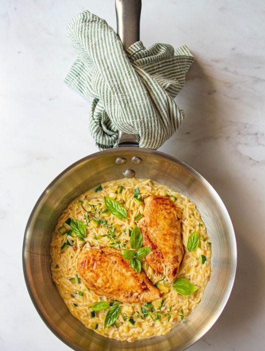 La cuisson, élément clé de cette recette d’orzo crémeux au poulet et courgette