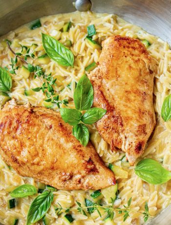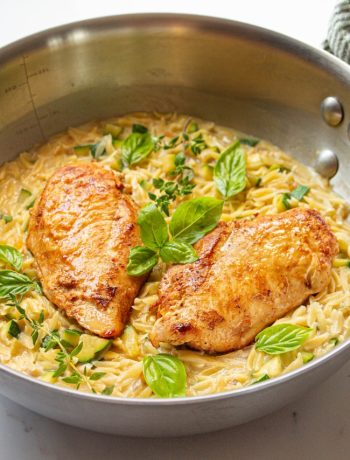 Et c’est bien là que j’interviens ! Dans ma recette d’orzo crémeux au poulet et courgette, c’est bien l’orzo qui est la star de l’assiette !