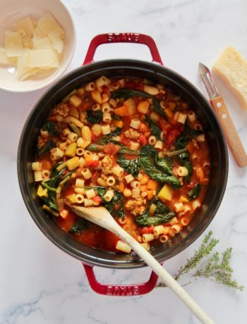 Alors la pasta e fagioli est une recette italienne (on s’en serait douté !!) traditionnelle. C’est une soupe de pâtes et haricots blancs avec les fameuses pâtes « Ditalini ». Il existe plusieurs variantes selon les régions. J’ai pris quelques (grandes) libertés pour réaliser la pasta e fagioli, façon Casserole et Chocolat …