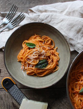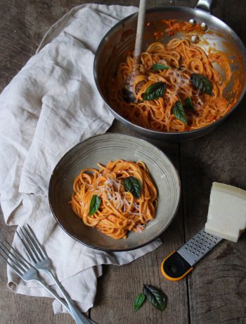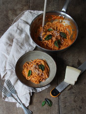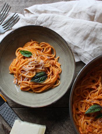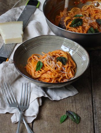 Revenons à la recette… Ces pâtes tomate et vodka ne sont pas réservées aux adultes… 😉 La vodka va cuire, donner un peu de goût et il n’y aura plus vraiment d’alcool dans votre plat final. Donc pas d’inquiétude de ce côté. D’ailleurs, si vous craignez cet ingrédient ou si vous n’avez pas de vodka chez vous, vous pouvez choisir de ne pas le rajouter. Vos pâtes resteront délicieuses.