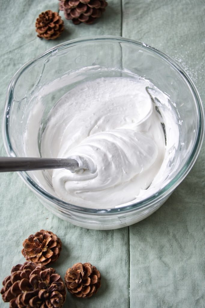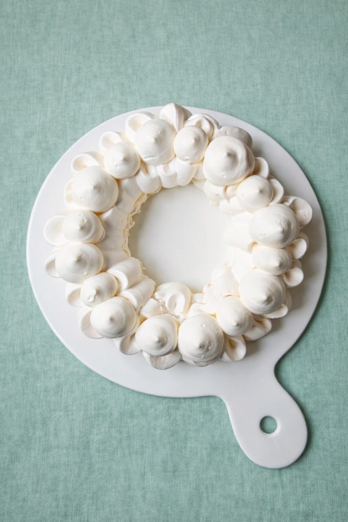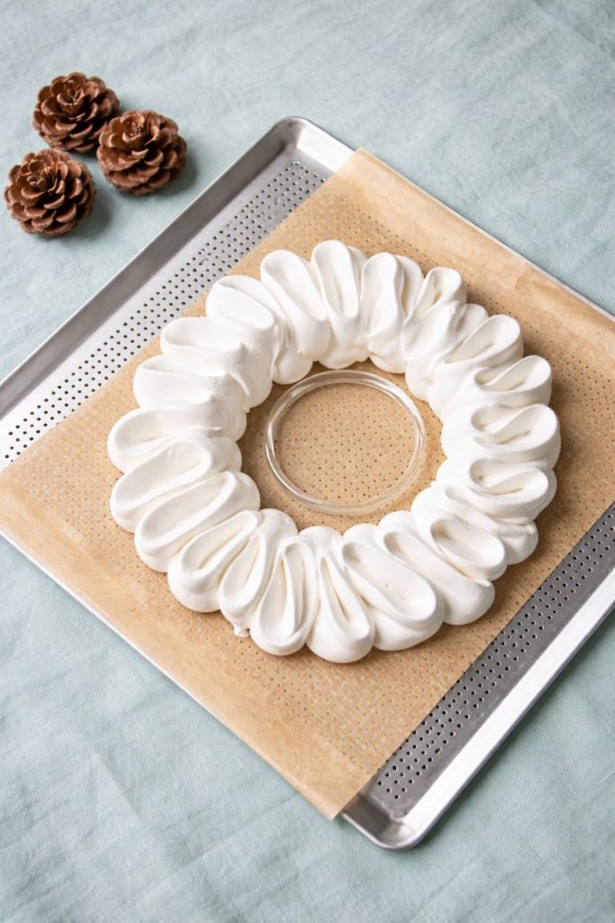 J’ai choisi de réalisé ma meringue en couronne, à l’aide d’une douille Saint Honoré. En pochant la meringue, on on effectue une danse de courbes. Je trouve ça assez poétique…