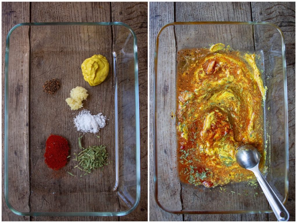 La marinade dans un bol ou plat à gratin