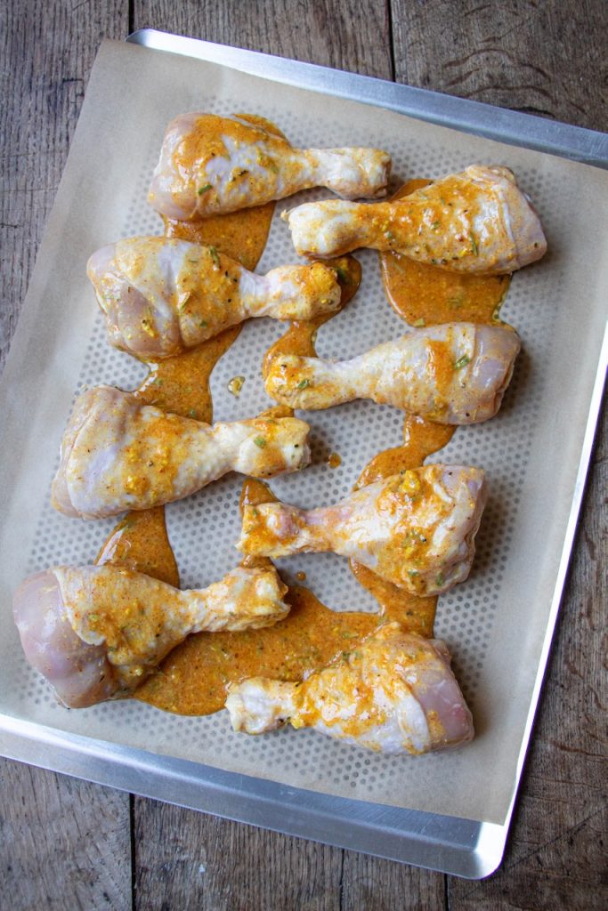 Disposez vos pilons de poulet sur une plaque recouverte de papier sulfurisé.