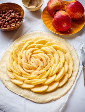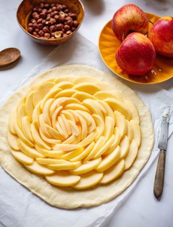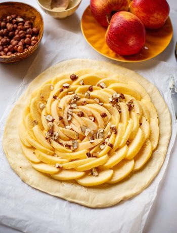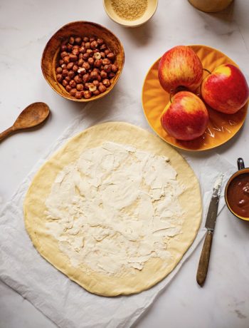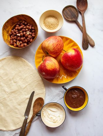 Allez, on enfile le tablier et on va en cuisine pour préparer ma pizza sucrée aux pommes et noisettes…
